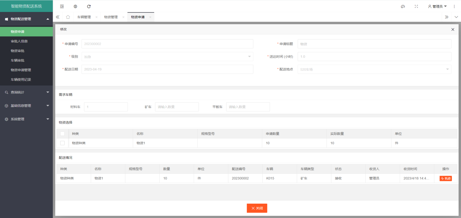 智能物資配送系統(tǒng)通過礦車的申請(qǐng)、配送物資的申請(qǐng)后,在系統(tǒng)中對(duì)井下配送物資、裝車與礦車定位跟蹤(需要與井下定位系統(tǒng)對(duì)接)。利用手機(jī) APP 功能,實(shí)現(xiàn)礦車定位系統(tǒng)數(shù)據(jù)的實(shí)時(shí)傳輸。各級(jí)領(lǐng)導(dǎo)、使用單位和配送單位能夠及時(shí)了解礦車狀態(tài)、礦車運(yùn)行軌跡、礦車各狀態(tài)時(shí)間等信息。通過礦車的領(lǐng)用、歸還和移交功能對(duì)非配送礦車進(jìn)行流動(dòng)管理,并對(duì)礦車運(yùn)行情況進(jìn)行定位跟蹤。實(shí)現(xiàn)礦內(nèi)全部礦車(包含非配送礦車)、全部配送物資(包含修舊利、廢物資)的統(tǒng)一管理。